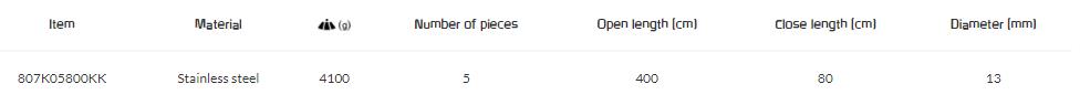 Composed by 5 pieces length 80 cm each, diameter 13 mm, total length 400 cm