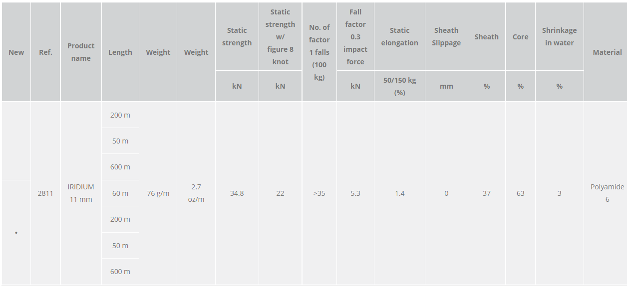 直徑11mm靜力A類繩,適用于高強(qiáng)度使用環(huán)境,兼容大多機(jī)械類繩索裝置,32股繩線編織外皮包裹強(qiáng)壯的繩索內(nèi)芯。墜落系數(shù)0.3時(shí)的首次沖擊為5.3KN;墜落系數(shù)1時(shí)墜落次數(shù)>35次;斷裂極限:34.8KN;8字結(jié)點(diǎn)拉力:22KN;靜力延展率:1.4%;外皮滑動(dòng)率0%;外皮所占比重37%;縮水率3%。重量:76克/米; 材質(zhì):Polyamide6。CE EN1891/A+EAC+UIAA。顏色:白、紅、黃、桔、黑五種顏色可選。