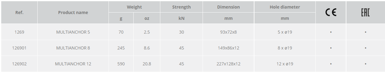 8孔鋁合金錨固點(diǎn),尺寸:149*86*12 mm,孔徑:19mm,適合用于救援時(shí)設(shè)置錨點(diǎn),拉力:45KN,重量:245g。 認(rèn)證標(biāo)準(zhǔn):CE0123