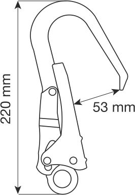 鋼制連接大掛鉤,單手操作,雙重安全鎖定設(shè)計。斷裂拉力(KN):25,鎖體尺寸:220*122mm,開門尺寸:53mm,重量:470g。認證標準:CE EN362+EAC+ANSI