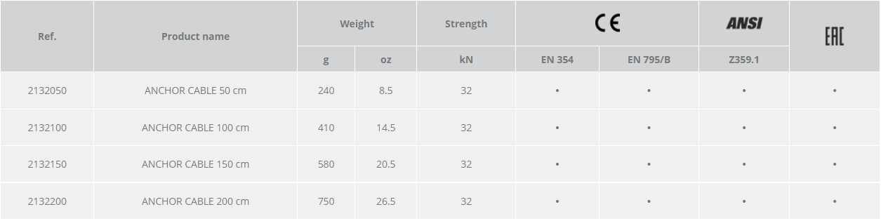 7mm鍍鋅耐切割鋼纜,兩端設計有連接環(huán);外皮包裹15mm塑料防護套;適用于尖銳及磨損較大的固定點;長度:150cm;拉力:32KN;重量:580g。認證標準:CE EN795/B+EN354+ANSI Z359.1+EAC