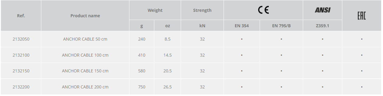 7mm鍍鋅耐切割鋼纜,兩端設(shè)計(jì)有連接環(huán);外皮包裹15mm塑料防護(hù)套;適用于尖銳及磨損較大的固定點(diǎn);長度:200cm;拉力:32KN;重量:750g。認(rèn)證標(biāo)準(zhǔn):CE EN795/B+EN354+ANSI Z359.1+EAC