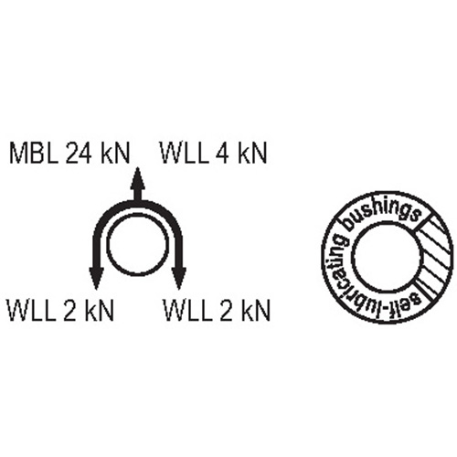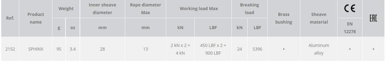 加強型固定側板式單滑輪,超大承重連接孔,一側可安裝抓結,自動潤滑軸套設計適用于低速工作環(huán)境,工作效率:80%,最大過繩直徑:13mm。鋁合金材質側板和轉輪,不銹鋼輪軸,拉力:24KN,工作負荷:2KN*2=4KN,尺寸:高86mm*寬50mm,承重掛點孔徑19mm,重量:95g。認證標準:CE EN12278+EAC