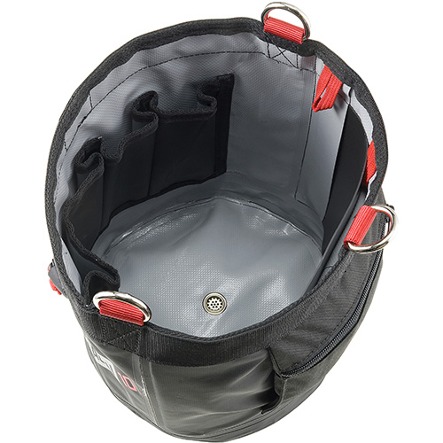 適用于搬運(yùn)和攜帶工具。PVC500D選材制成,高頻焊粘技術(shù)。三個(gè)金屬環(huán)用于連接安全帶或懸掛在繩索及固定結(jié)構(gòu)上。半剛性結(jié)構(gòu)在使用過程中保持桶包打開狀態(tài)。不使用時(shí)可收縮存放在口袋中。寬大的內(nèi)部設(shè)計(jì),便于整理工具。內(nèi)部掛環(huán)設(shè)計(jì)用于連接型號(hào)2792款工具袋(單獨(dú)出售)。透明標(biāo)簽袋。容量:20L,重量:1100g。