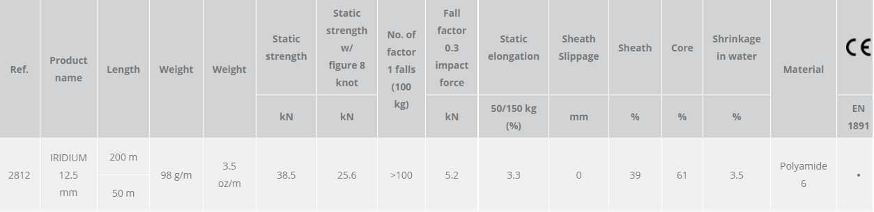 直徑12.5mm靜力A類繩,適用于高強(qiáng)度工作環(huán)境,繩芯緊密工藝處理,擁有較高的斷裂拉力和抵抗沖擊力的能力,外皮40股繩線編織。墜落系數(shù)0.3時(shí)的首次沖擊為5.2KN;墜落系數(shù)1時(shí)墜落次數(shù)>100次;斷裂極限:38.5KN
