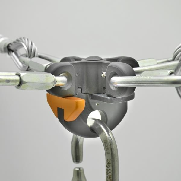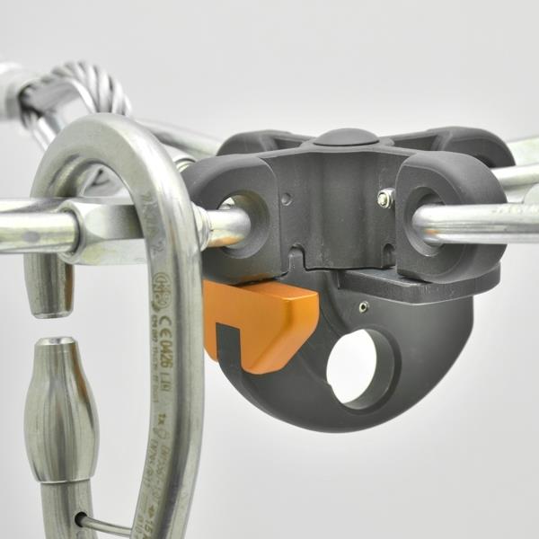 運(yùn)作原理非常簡(jiǎn)單:掛鉤開(kāi)口小于纜索的直徑,但大于分力板的厚度。這樣可以確保安全,一旦扣上救生索,在您的課程結(jié)束之前,救生索都不可能脫出。如果參于者生病、或出現(xiàn)風(fēng)暴、火災(zāi)等意外,只有使用提供給公園管理者的特殊鑰匙,才能夠解鎖套筒,然后迅速撤離。