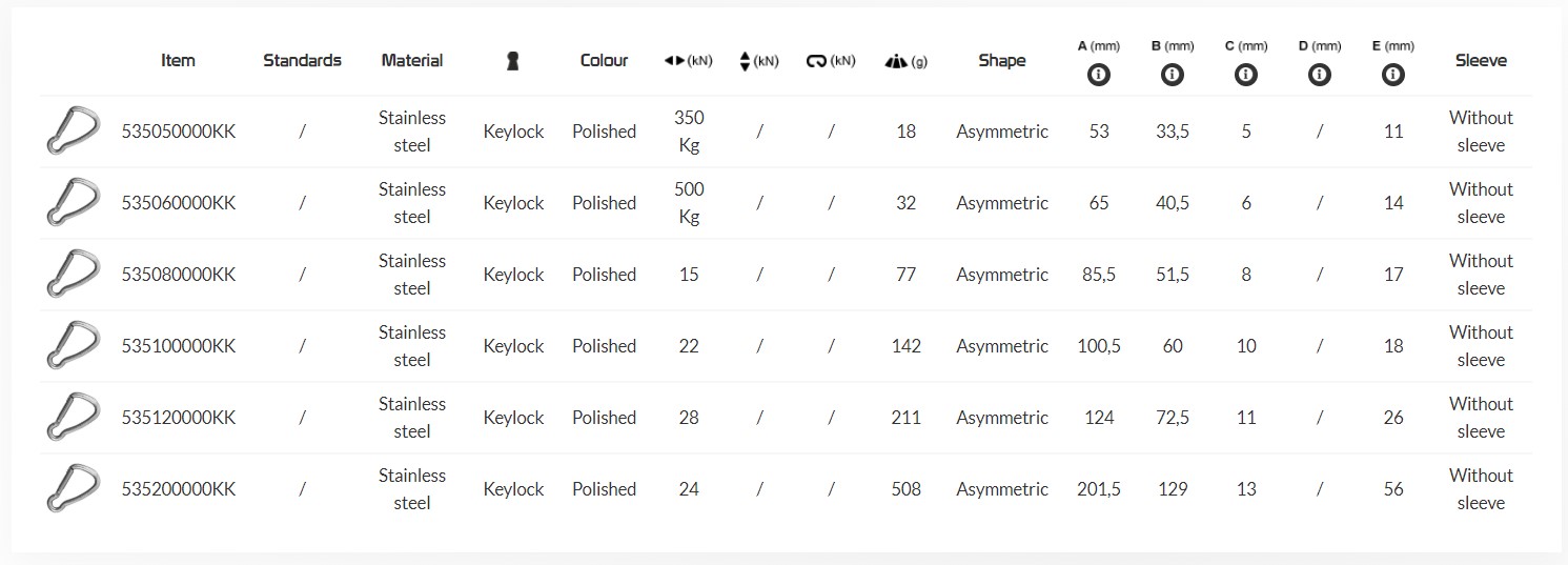 Asymmetric stainless steel carabiner, not for climbing or human support.