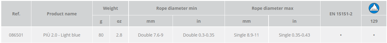 The Più 2.0 has been designed to deliver optimal performance with the new generation of skinny ropes that have gained popularity in recent years. Using a variable notched design with smooth teeth on the brake side of the device along with narrower slots for the rope, the Piu 2.0 locks onto skinny ropes with more friction than other tube-style devices. Other features include the ability to set up the device in auto-block mode for belaying two seconds, a large rigging hole that allows a locking carabiner to rotate all the way through, a specially shaped hole that captures the nose of a keylock carabiner (specifically designed for use with the HMS Nitro and HMS Compact Lock carabiners) which can then be used as a lever for releasing tension if a second locks the device in auto-block mode, and a diagonal cable that prevents the rope from rubbing and jamming.