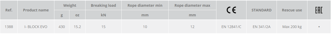 - EN 341/2A as an emergency evacuation device on a single line, 11 mm semi-static rope (certified with rope Teufelberger Patron 11 mm, compatible with rope Iridium 11 mm).