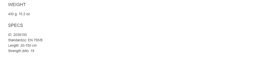 Adjustable high strength webbing anchor constructed from 45 mm polyamide webbing with fixed steel rings on the ends. Adjustable from 80 to 130 cm.