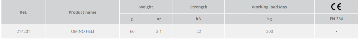 Breaking load: 22 kN. Working load limit: 300 kg. Shock indicator: breakage of secondary stitching at 4 kN.