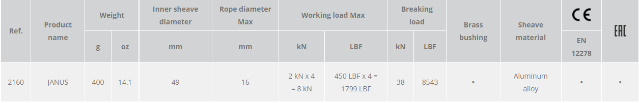 A high strength multifunctional double pulley for block-and-tackle systems and complex operations. Features large wheels, a main attachment point that accommodates three carabiners, and a large becket with a large bottom attachment point and two secondary attachment points on the sides for linking, positioning and attaching progress capture systems. For use with ropes up to 16 mm. Prusik minding, the self-locking knot can be installed on both sides of both wheels. Self-lubricated bushings are sufficient for light applications at low speed. Efficiency: 90%. Aluminum alloy body and wheels, stainless steel axle.