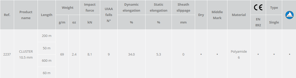 10.5 mm dynamic rope with a low impact force designed for intensive use.
