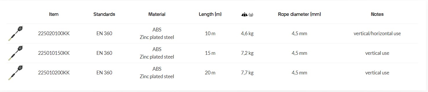 Retractable fall arrester with automatic recall with 4.5 mm steel cable available in three lengths (10m, 15m and 20m).