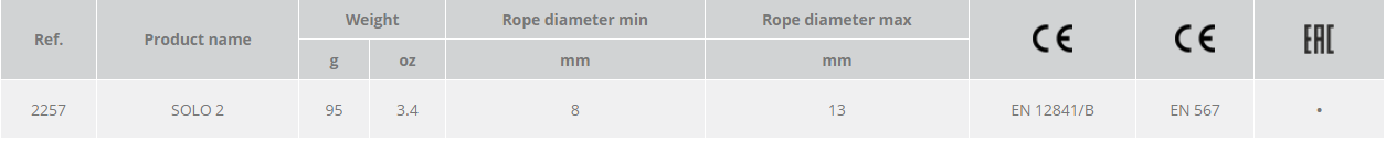 Standards: - EN 12841/B for semi-static ropes ranging from 10 to 13 mm. - EN 567 for semi-static and dynamic ropes ranging from 8 to 13 mm.