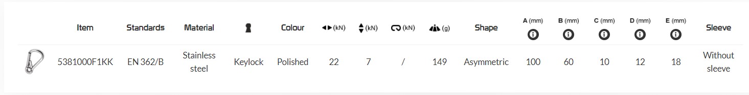 Stainless steel carabiner with straight gate, eyelet and wire gate.