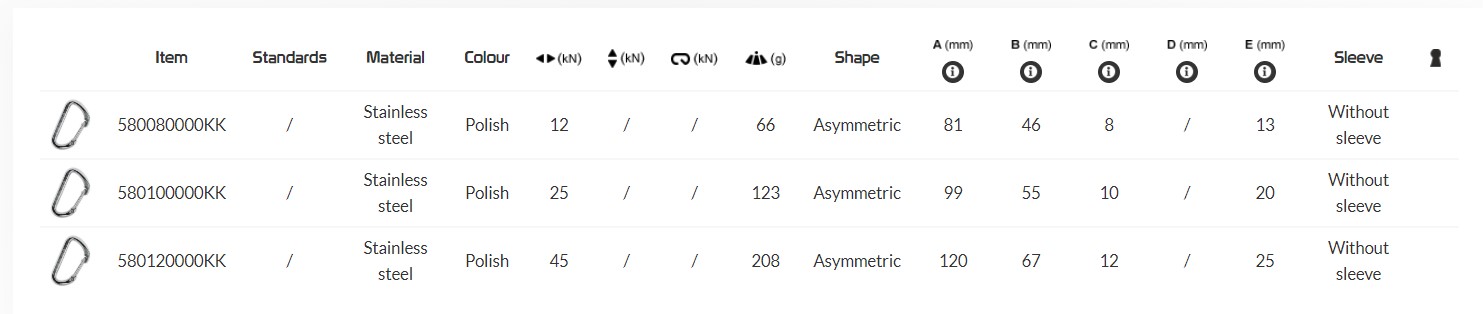 AISI 316 stainless steel carabiner with wire gate and asymmetric shape.