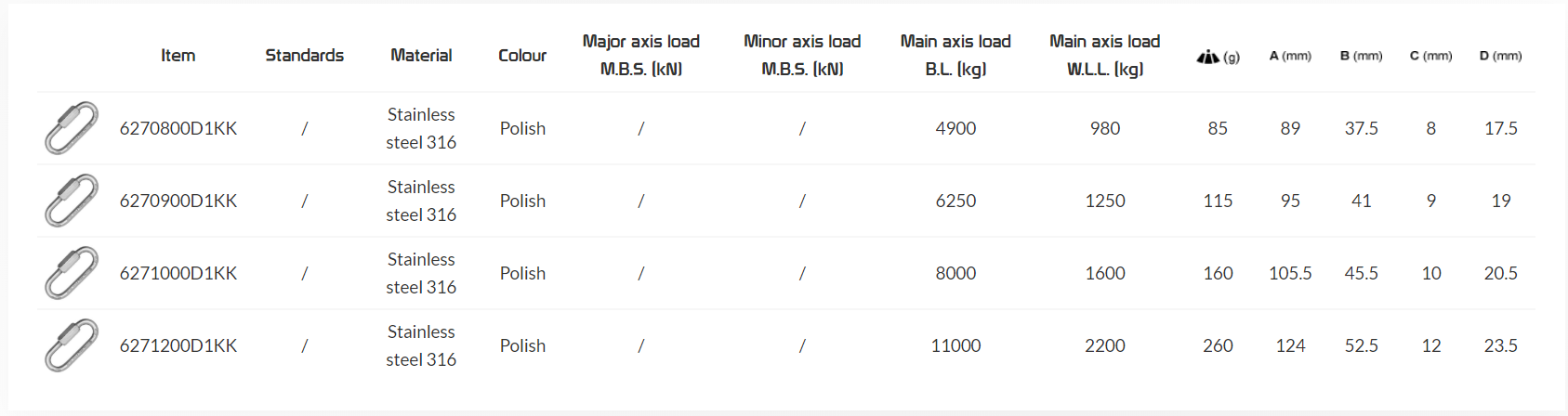 Oval stainless steel 316 quick link with large opening.