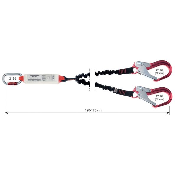 32 mm polyamide webbing lanyards with rewind elastic sewn in to automatically contract the length of the lanyard. Equipped with standard shock absorber (ref.2029).