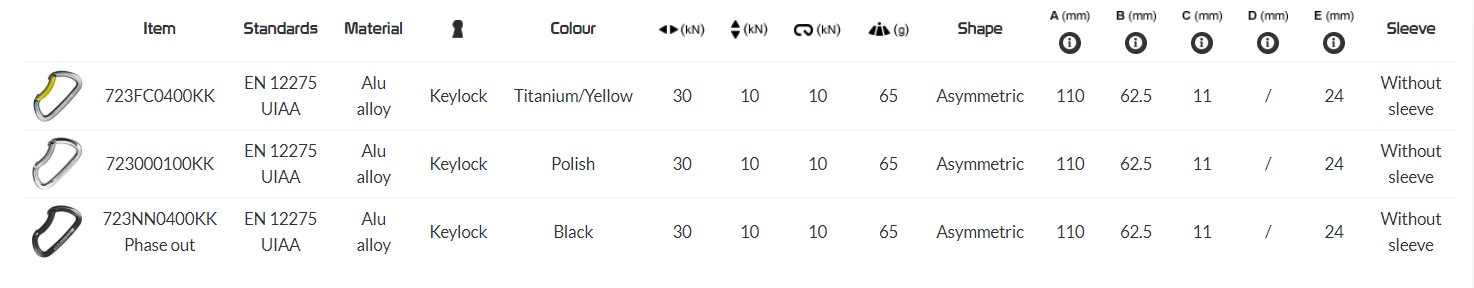 Heavy load aluminum carabiner. Designed for climbing and the use on quickdraws. The bent gate allows an easy insertion of the rope. The contact surfaces are wider to reduce wear and improve the passage of the rope. The D shape transfers the majority of the load on the main axis of the carabiner, which is the most resistant.