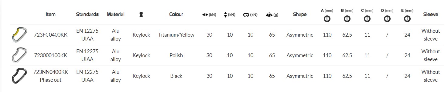 Heavy load aluminum carabiner. Designed for climbing and the use on quickdraws. The bent gate allows an easy insertion of the rope. The contact surfaces are wider to reduce wear and improve the passage of the rope. The D shape transfers the majority of the load on the main axis of the carabiner, which is the most resistant.