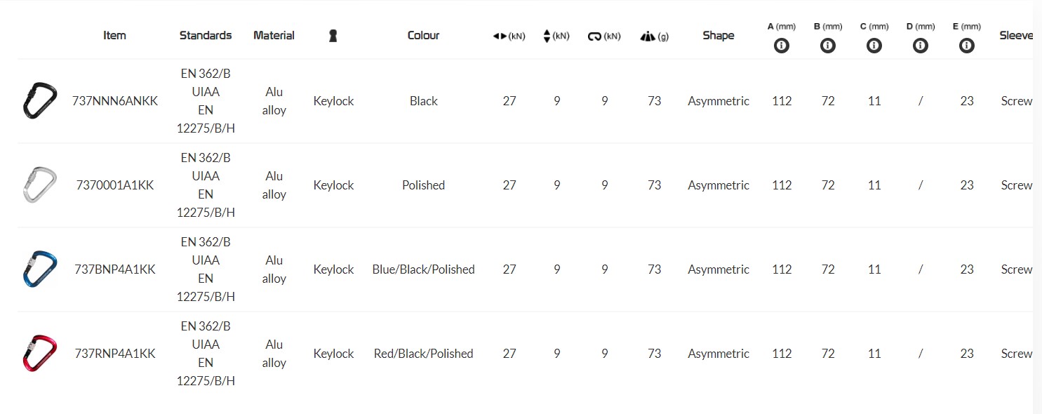 Light alloy carabiner with straight gate and wide opening. The particular D shape prevents the rotation of the carabiner and allows to distribute the load along the major axis.