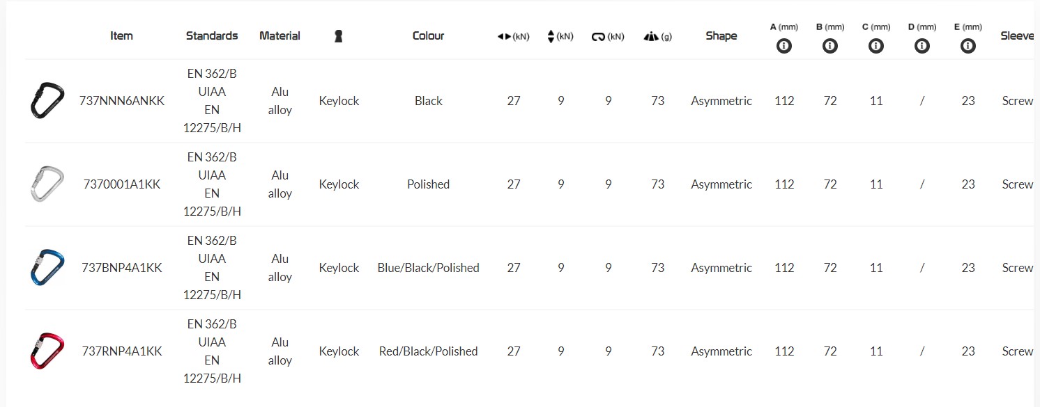 Light alloy carabiner with straight gate and wide opening. The particular D shape prevents the rotation of the carabiner and allows to distribute the load along the major axis.