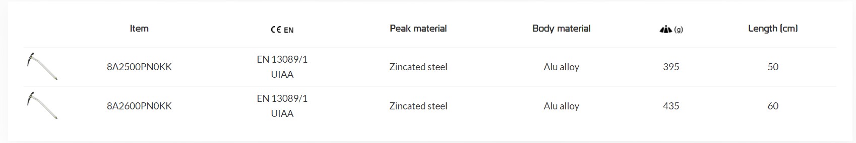 Classic mountaineering ice axe. Light alu alloy body, zinc plated steel peak and spike.