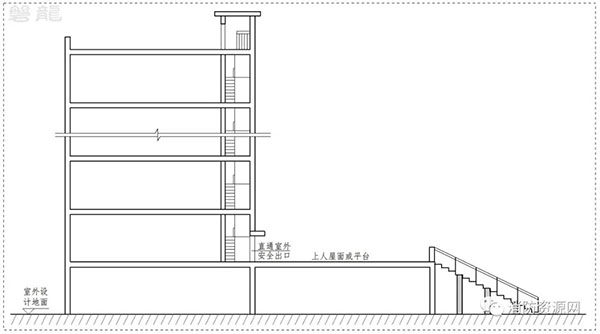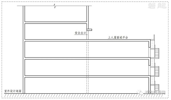 1.3 上人屋面或平臺(tái)通過(guò)滿足疏散要求的階梯等直達(dá)地面,階梯不受建筑外墻的燃燒性能和耐火極限以及建筑門窗洞口影響。(圖示5)