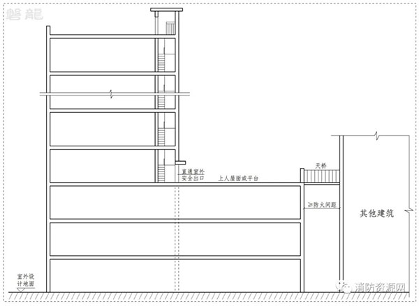 1.2 上人屋面或平臺(tái)通過(guò)滿足規(guī)范要求的天橋、連廊直達(dá)其他建筑(圖示4):