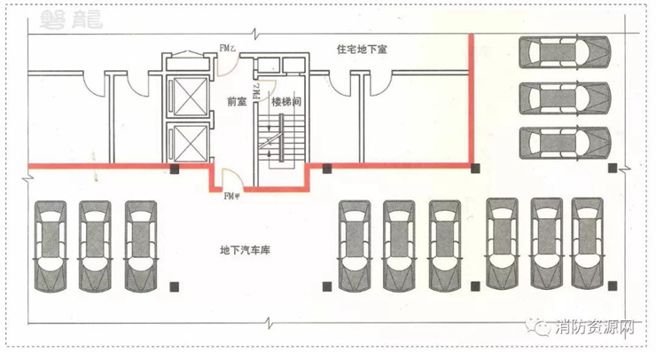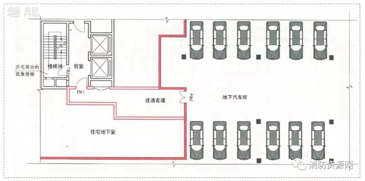 四、除住宅地下室的情況外,汽車庫不得借用其他民用建筑的疏散樓梯:1、與住宅地下室相連通的地下汽車庫、半地下汽車庫,人員疏散可借用住宅部分的疏散樓梯(圖示2);當(dāng)不能直接進(jìn)入住宅部分的疏散樓梯間時(shí),應(yīng)在汽車庫與住宅部分的疏散樓梯之間設(shè)置連通走道,走道應(yīng)采用防火隔墻分隔,汽車庫開向該走道的門均應(yīng)采用甲級防火門(圖示3)。(6.0.7)