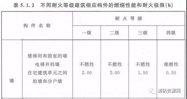 住宅建筑單元之間的墻和分戶墻,不同耐火等級(jí)建筑相應(yīng)構(gòu)件的燃燒性能和耐火極限不應(yīng)低于《建規(guī)》表5.1.2的規(guī)定。(5.1.2)