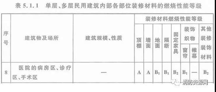 二、高層醫(yī)院建筑的病房區(qū)、診療區(qū)、手術(shù)區(qū),內(nèi)部各部位裝修材料的燃燒性能等級,不應(yīng)低于《建筑內(nèi)部裝修設(shè)計防火規(guī)范》表5.2.1的規(guī)定。