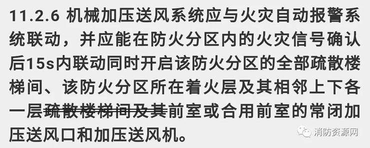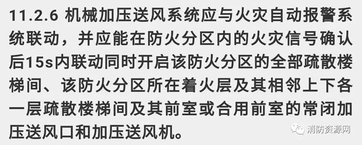 機械加壓送風系統(tǒng)應與火災自動報警系統(tǒng)聯(lián)動,當防火分區(qū)內(nèi)火災確認后,應能在15s內(nèi)聯(lián)動開啟以下部位的常閉加壓送風口和加壓送風機: