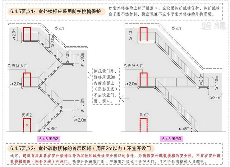 《<建筑設(shè)計(jì)防火規(guī)范>圖示及應(yīng)用》第6.4.5條示意了室外疏散樓梯的防護(hù)挑檐做法,附文末。
