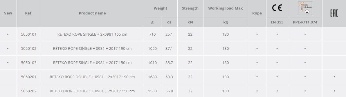 交替攀爬保護器挽索,采用10.5mm靜力繩連接,長度:150cm,基本配置:5000*1+981*1+2017*2,重量:1580g。認證標準:CE EN355+CNB/P/11.074
