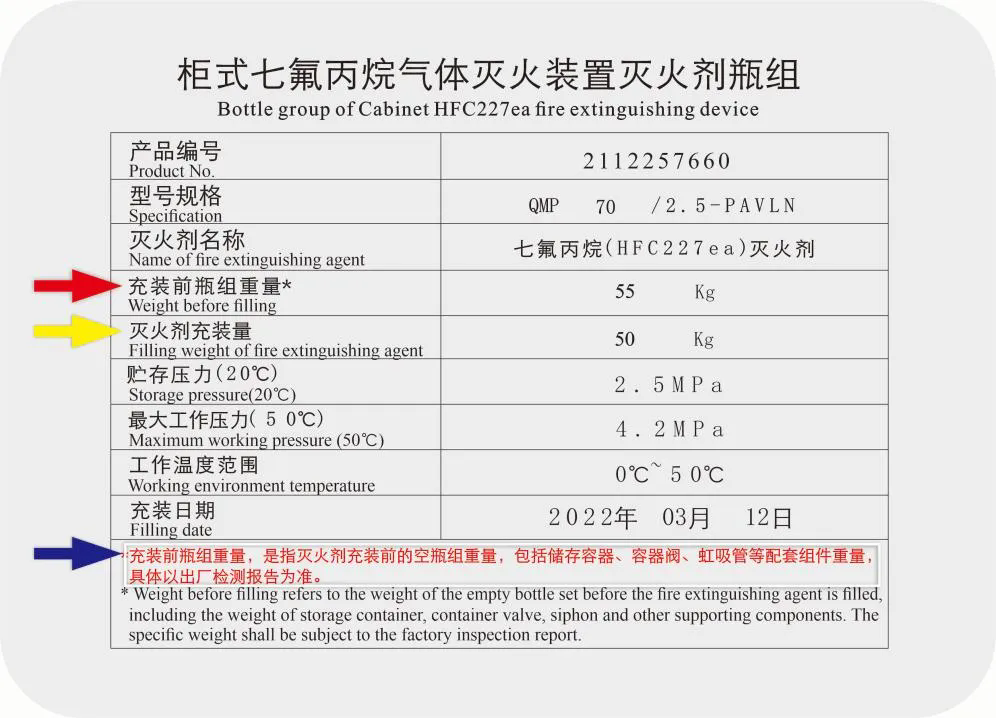 (1)僅標(biāo)識“滅火劑充裝量”:缺失了瓶組本體的基準(zhǔn)重量,現(xiàn)場驗(yàn)收或日常檢查時(shí),無法通過簡單稱重反向推算出實(shí)際滅火劑存量,監(jiān)督檢查形同虛設(shè)。