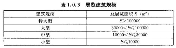 3、展覽建筑規(guī)模可按基地以內(nèi)的總展覽面積劃分為特大型、大型、中型和小型,并應(yīng)符合表1.0.3的規(guī)定。(1.0.3)