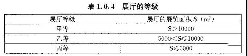 4、展廳的等級可按其展覽面積劃分為甲等、乙等和丙等,并應(yīng)符合表1.0.4的規(guī)定。(1.0.4)