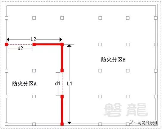 1、當(dāng)計(jì)算B區(qū)與A區(qū)之間的卷簾寬度時(shí),防火分隔部位的寬度按L3計(jì)算:當(dāng)L3≤30米時(shí), d3≤10米; 當(dāng)L3>30米時(shí), d3≤(1/3)L3,且d3≤20米;