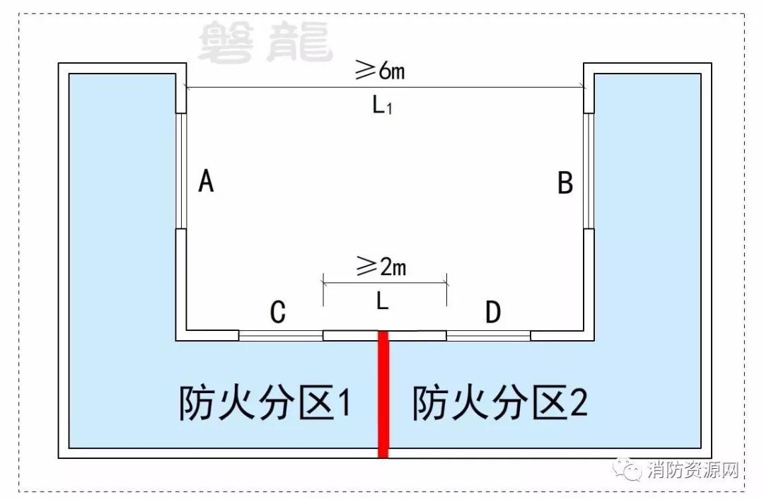 一、對(duì)于只需要采用防火隔墻分隔的兩個(gè)區(qū)域,處于迎火面的門(mén)窗洞口,通常需要保證6m的防火間距,處于側(cè)火面的門(mén)窗洞口,通常僅需保證1m的防火間距。