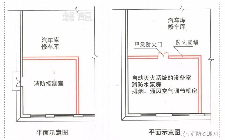 1、屬于民用建筑的地下或半地下設(shè)備用房,或主要用于民用建筑的設(shè)備用房,應(yīng)執(zhí)行《建筑設(shè)計防火規(guī)范》,設(shè)備用房的防火分區(qū)最大允許建筑面積不應(yīng)大于1000㎡(設(shè)置自動滅火系統(tǒng)時不大于2000㎡)。2、地下汽車庫適應(yīng)《汽車庫、修車庫、停車場設(shè)計防火規(guī)范》,防火分區(qū)最大允許建筑面積不應(yīng)大于2000㎡(設(shè)置自動滅火系統(tǒng)時不大于4000㎡)。由上可知,地下汽車庫的防火分區(qū)面積較民用建筑的地下設(shè)備用房整整大了一倍,如交叉設(shè)置必然造成混亂,因此民用建筑的設(shè)備用房不應(yīng)劃入汽車庫防火分區(qū)。注:對于僅供汽車庫使用或主要供汽車庫使用的附屬設(shè)備用房,可以和汽車庫劃為同一防火分區(qū)。二、民用建筑的設(shè)備用房,不應(yīng)向汽車庫開設(shè)疏散門或安全出口。1、汽車庫的安全疏散距離相對寬松:“汽車庫室內(nèi)任一點至最近人員安全出口的疏散距離不應(yīng)大于45m,當(dāng)設(shè)置自動滅火系統(tǒng)時,其距離不應(yīng)大于60m(6.0.6)”,汽車庫的安全疏散和民用建筑部分不應(yīng)混雜。2、汽車庫規(guī)范已明確“防火墻上通向相鄰防火分區(qū)的甲級防火門,不得作為第二安全出口(6.0.2)”,也就是說“汽車庫的防火分區(qū)不得借用相鄰防火分區(qū)的安全出口”。綜上,既然汽車庫自屬的防火分區(qū)之間都不能借用安全出口,當(dāng)然更不會允許民用建筑用房向汽車庫開設(shè)疏散門或借用安全出口。依此,民用建筑的設(shè)備用房,不應(yīng)向汽車庫開設(shè)疏散門或安全出口。三、附設(shè)在汽車庫、修車庫內(nèi),且主要為其服務(wù)的消防控制室、自動滅火系統(tǒng)的設(shè)備室、消防水泵房和排煙、通風(fēng)空氣調(diào)節(jié)機房等,應(yīng)采用防火隔墻和耐火極限不低于1.50h的不燃性樓板相互隔開或與相鄰部位分隔,部分設(shè)備室的疏散門可以向汽車庫或修車庫開啟,詳見圖示1。