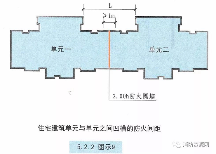 四、住宅建筑單元與單元之間的凹槽,門窗洞口的防火間距(L),一般不小于6m,如下圖所示:(當(dāng)不滿足要求時(shí),可以采用乙級(jí)防火門窗)
