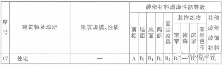 五、符合一定條件的住宅建筑,內(nèi)部裝修材料的燃燒性能等級(jí)可在以上列表的基礎(chǔ)上降低一級(jí),詳見《建筑內(nèi)部裝修設(shè)計(jì)防火規(guī)范》:5.1.2、5.1.3、5.2.2、5.2.3、5.3.2等。