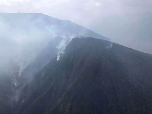 俯瞰四川省涼山州木里縣雅礱江鎮(zhèn)火場火點(4月1日攝)。新華社發(fā) 3月30日17時許,四川省涼山州木里縣雅礱江鎮(zhèn)立爾村發(fā)生森林火災(zāi)。31日,在撲火行動中,受風(fēng)力風(fēng)向突變影響,突發(fā)林火爆燃,目前已造成..